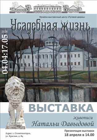 В музейно-выставочном центре "Путевой дворец" представлен творческий проект Натальи Давыдовой "Усадебная жизнь". Экспозиция выставки, посвящённой Русской усадьбе, включает в себя более 30 работ, созданных в технике масляной живописи. Выставку уже можно посетить, а презентация с участием художника пройдёт 18 апреля в 14.00. Приглашаются все желающие, вход на презентацию свободный.